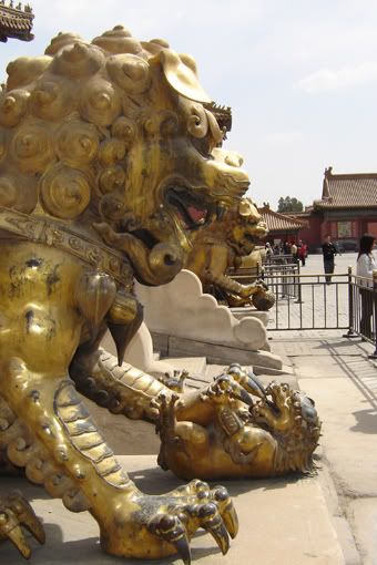 The Forbidden City was home to 10,000 people including 3,000 unix within the confines of this gigantic fortress which was home to the Ming and Qing dynasties. The Forbidden City was off limits for 500 years to the general public. Its main function was to house the emperor and all of his ceremonial duties as the son of Heaven. There are more than 25 halls, temples and gates leading from one complex to the next. Each section of the city comprises a formal gate with flanking halls and the main hall dedicated to different aspects of his rule. For instance, the Hall of Supreme Harmony was for performing state functions, and is the tallest building in Beijing. Other Halls and Gates include the Hall of Complete Harmony, Palace of Heavenly Purity, Hall of Mental Cultivation, Supreme Harmony Gate, and Gate of Prosperous Harmony. As most of these buildings are in different states of repair, it was hard to imagine the grandeur that it once held. The size of the entire complex, along with the fact that most buildings were covered in scaffolding for preparation for the Olympics, and the number of tourists rendered this experience somewhat empty for us.