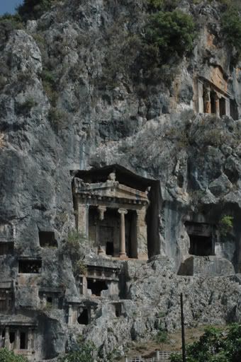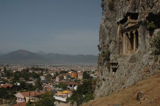 We spent a good portion of that afternoon wandering around the town to discover that Fethiye is an old town dating back to 400 BC (when it was know as Telmessos) . This is evident of the Lycian tombs on a nearby mountain, and sacrophagi sprinkled throughout this small city. A combination of Greek and Persian architectural styles is still visible on many of the tombs despite the deterioration over the centuries; as in the tomb of Amyntas - considered by many as the symbol of Fethiye. At the center of town still exists a small amphitheater, but it is in very poor condition. These days Fethiye is a town of just over 60,000 people, that caters mainly to tourists as the streets next to the harbour house copious small and large size restaurants, souvenir shops and travel agencies.