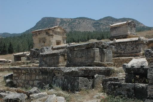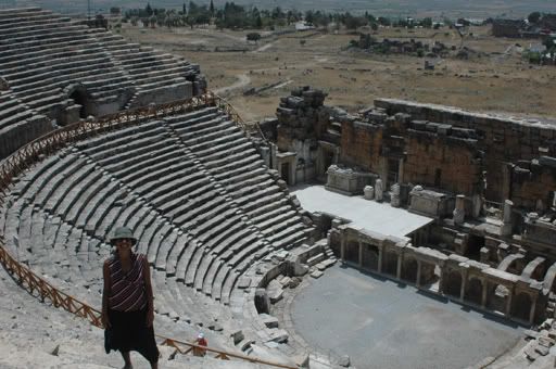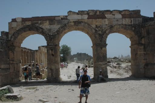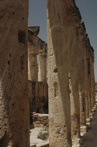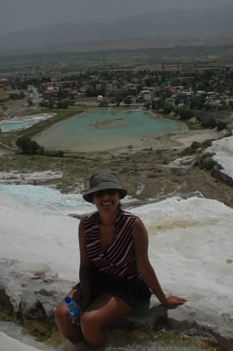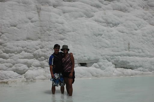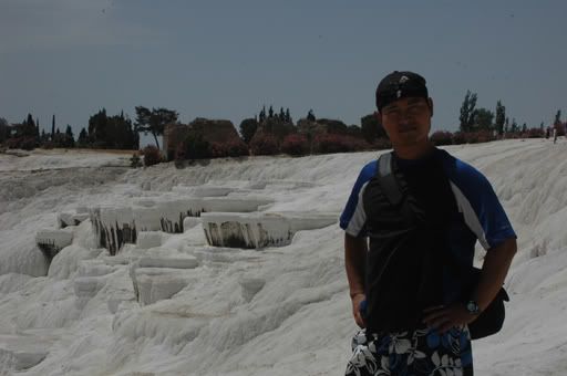 Chris and I had seen many familiar pics of Pamukkale in postcards and books before arriving here and were saddened by the damage that has occurred to this beautiful place as a result of tourism. The image of the castle is still something else as when you first enter the town, the first thing you see is what looks like this large hill of white snow in the middle of this small town gleaming bright due to the blazing heat. Unfortunately though, you can see where tourists have left their damage as some areas have turned a gaudy yellow color (kind of looks like snow that has been peed in) and the water levels have dramatically reduced to what was once there as evidenced by past photos and books.