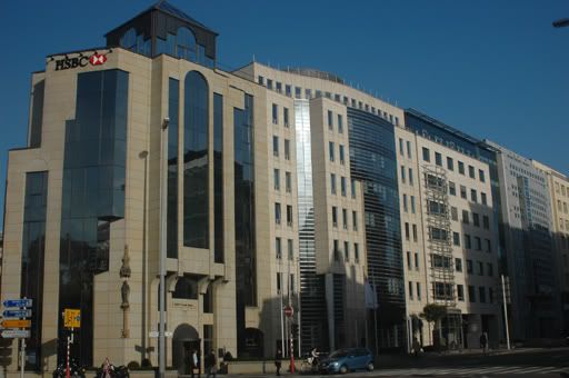 HSBC bank and other modern buildings, this appears to be the financial district of the city. Notice the figurine on the corner of the building, a bold move from the architect. Is this to be the new church?