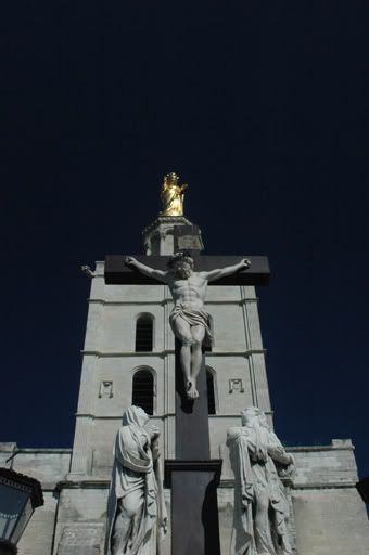 Next to the Palace of the Popes was the exquisite Cathedral of Notre Dame-des-Doms with its gold Virgin Mary statue sitting atop the church looking down on the statue of Jesus on the cross. The interior of the church was not your usual Notre Dame like interior. There were not as many stained windows, making the church rather dark. Instead the main altar had fresco paintings adorning the ceiling above it.