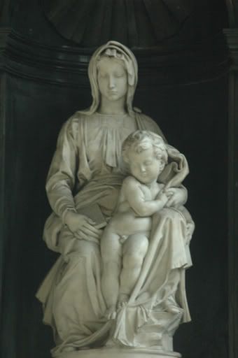 Another favorite of ours was the Onze Lieve Vrouwekerk, the Chuck of Our Lady. This church took over 200 years to build and the interior was a little different compared to most other churches. It’s white walls, stark columns and black and white tiled floor gave the church a medieval simplicity. The church’s artistic highlight and what made Chris and I visit the church was Michelangelo’s sculpture Madonna and Child (1504-1505). This beautiful marble statue was imported by a Flemish merchant and was the only one of Michelangelo’s works to leave Italy during his lifetime. We stood there for a while admiring the fine details of this beautiful sculpture and the varying lights that were shining in on it from the church windows. A must see if you are in Bruges.