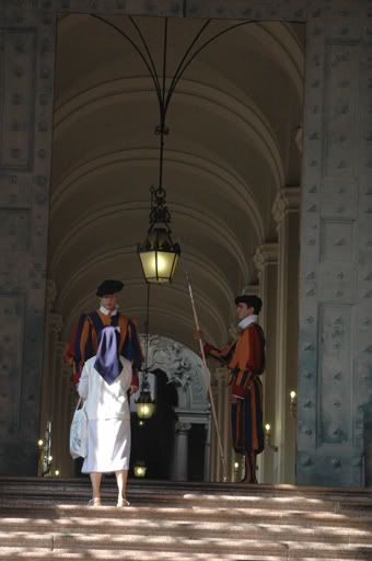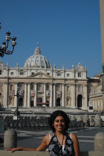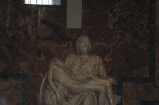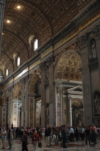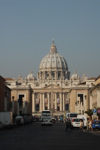 Walking to St. Peters Basilica is like making a pilgrimage - one that can affect any individual whether you’re religious or not. Perhaps this is one of the reasons behind building a church of such richness and grandeur, to not only appeal to the religious and Catholic but to also be a haven for all others to adore and appreciate. This was our frame of thought as we zigzagged through the maze of streets and whizzing cars to get to St. Peter’s. There was a sense of anticipation as we drew closer to the church and caught glimpses of the dome between the low lying buildings that stood between us and the masterpiece. Once we crossed the bridge into the Vatican City, our pace quickened unconsciously, like an infant stumbling into the arms of their parent. As we grew closer, we were both so overwhelmed by the architectural appearance of the basilica that neither one of us paid attention to the excessively long line of tourists waiting in queue to enter. A few years ago, we would have been able to walk right into the church without having to wait in line but since the Twin Towers attack in 2001, they have increased security measures and now enforce everyone to go through a metal detector.