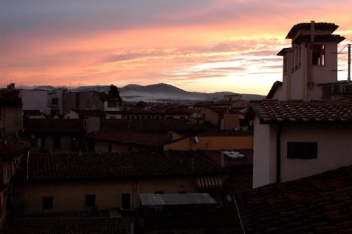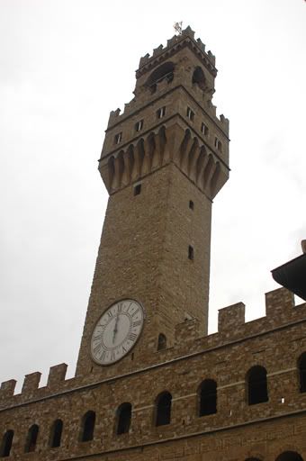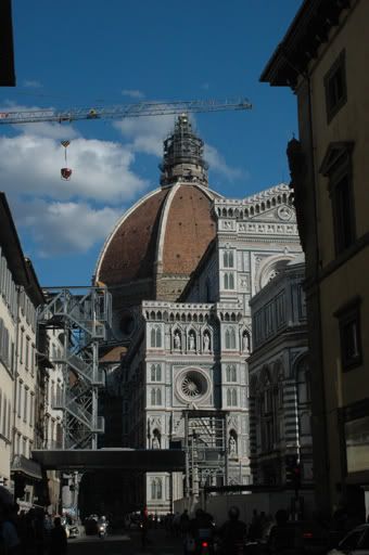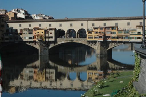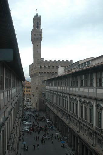 We got up with the sun to beat the line up at the Uffizi Gallery – this was the view from our pensione, not too bad for 45 Euros a night. I finally found this one after a two hour search.The Uffizi Gallery is not only the oldest art gallery in the world, but also the most important in all of Italy, and one of the greatest in Europe. With such acclamation it is not surprising that more than 1.5 million people visit it annually. The gallery owns about 4,800 works, only half are on view (1000 paintings, 300 sculptures, 46 tapestries, and 700 paintings kept in the Vasari corridor). It is now under constant renovation and expansion to house all of its collections. Some of the most famous of these include: Giotto’s Enthroned Madonna and Child with Angles, Annunciation by Simone Martine and Lippo Memmi, Botticelli’s Allegory of Spring and the Birth of Venus, the Tribuna room, Cupid playing a lute by Fiorentino (Rav’s favorite), The Doni Tondo (Holy Family) by Michelangelo, (does this guy ever sleep?), and The Venus of Urbino by Titian (said to be the most seductive nude of all time). Now multiply that by about 4000 times and you get the point. NO pictures were allowed so we apologize for the lack of images of these beautiful pieces of art. The 9.5 Euro entry fee also included sketches and sculptures and innovative theory and designs by Leonardo di Vinci. It was 9.5 Euros well spent.
