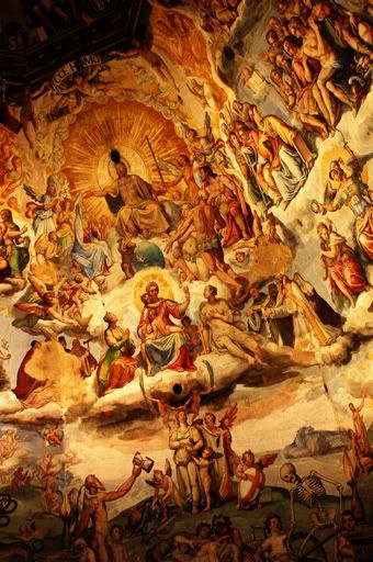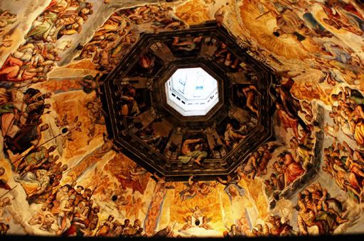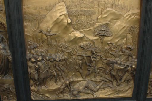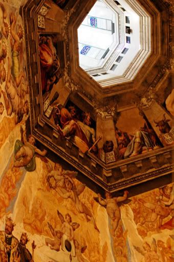 David vs. Goliath – one of the 10 well decorated panels depicting biblical scenes adoring the East door (known as the bronze gilded Gate of Paradise)We could not give up an opportunity to walk through the dome to the top. For 6 Euros, we got to ascend more than 463 steps, some steep, some narrow and some just insanely hazardous due to the traffic coming the opposite way. The dome is actually comprised of two separate walls – an exterior and interior massive mason walls with a void in the middle broken by occasional struts and staircases that connect the two walls. At the top of the dome was a great view of the city, but it was also an opportunity to view the frescos on the ceiling of the dome that made the journey up the Duomo a treat.