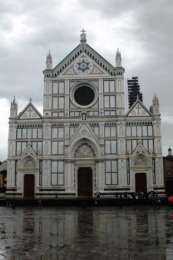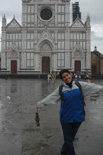Rav dancing in the rain in front of Santa Croce where the addition of marble facade by Niccolo Matas was made in the 19th century
