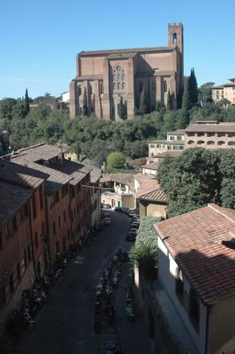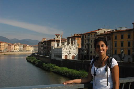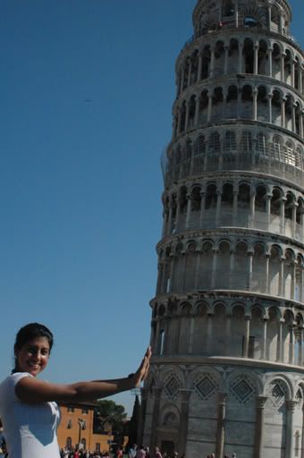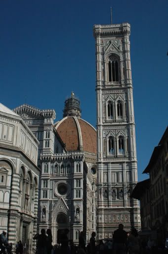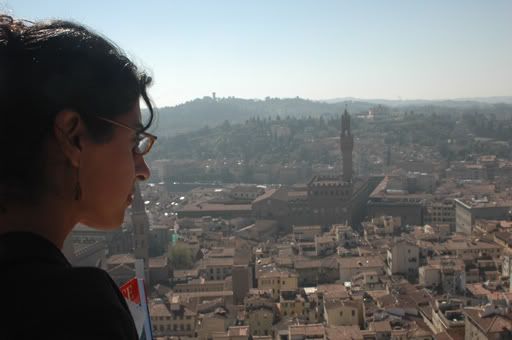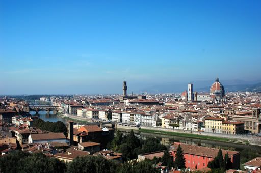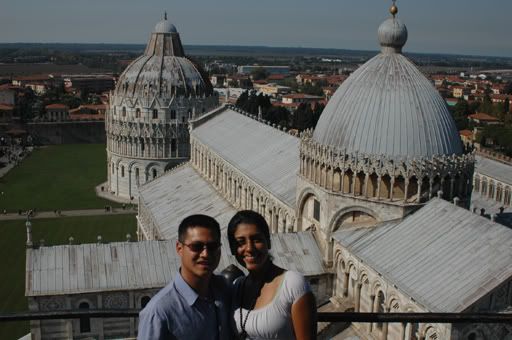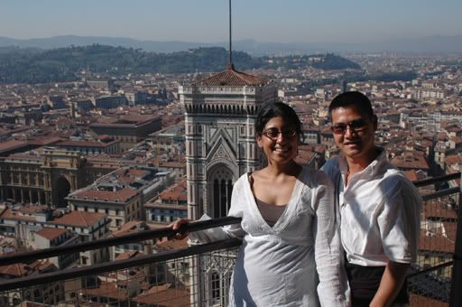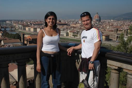 Neevar and I at Piazza MichelangeloWe had decided to make Florence our home for 6 nights, as we were tired of moving every two to three days. And as much as we love the cobble stones, the wheels on our duffel bags are starting to really show signs of wear and tear. After a two hour search within the city, where everything was booked solid, and what was not booked was only available for one or two nights at a cost of 85-110 Euros a night for a double with a private bathroom, I found the Albergo Marcella. This was a family run pensione for 45 Euros a night, close to the train station and only minutes away from all that Florence is famous for. Our room at the top of the building was spacious, bright and very clean. The view was to die for. Even though the bathroom was just down the hall, it was not too much of an inconvenience, although the noisy youngsters in the hostel next door were a bit of a nuisance. Florence is a great city, but we also had read about Pisa and Siena, two cities close enough that we could get to from Florence in an hour or so. We took advantage of that fact and planned two field trips to each of the cities.