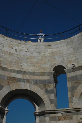 Here we are at the top of the tower with the Cathedral in the back ground. It was a picturesque day in the city of Pisa. Okay lets get the heck off this thing before it decides to continue to lean a little more