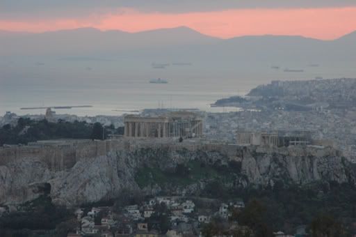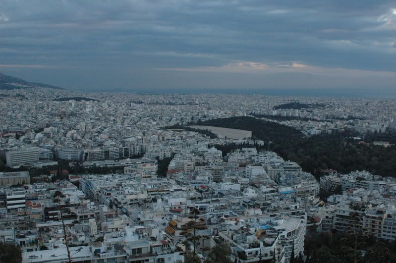 We dropped off our bags and hoofed it up to the Lykavittos Hill the highest point in all of Athens even higher then the Acropolis. This was highly recommended by a lovely couple from Scotland whom now reside in Greece, that I had talked to on the ferry ride back to Athens from Paros while Rav was getting some shut eye. It was not a far hike, but a steep one and with the strong winds coming in all direction it was a little troublesome at times and the cold air made it hard to breath as well. Upon arriving at the summit, the sun had already disappeared in to the horizon, but we did get a good glimpse of not only the Acropolis but all of Athens as well. Surprisingly, Athens is extremely large in area, much more than we had thought. This may be due to the fact that there are no signs of any major high rise area(s), which made the horizontal sprawl the only solution to accommodate the 3.7million inhabitants.